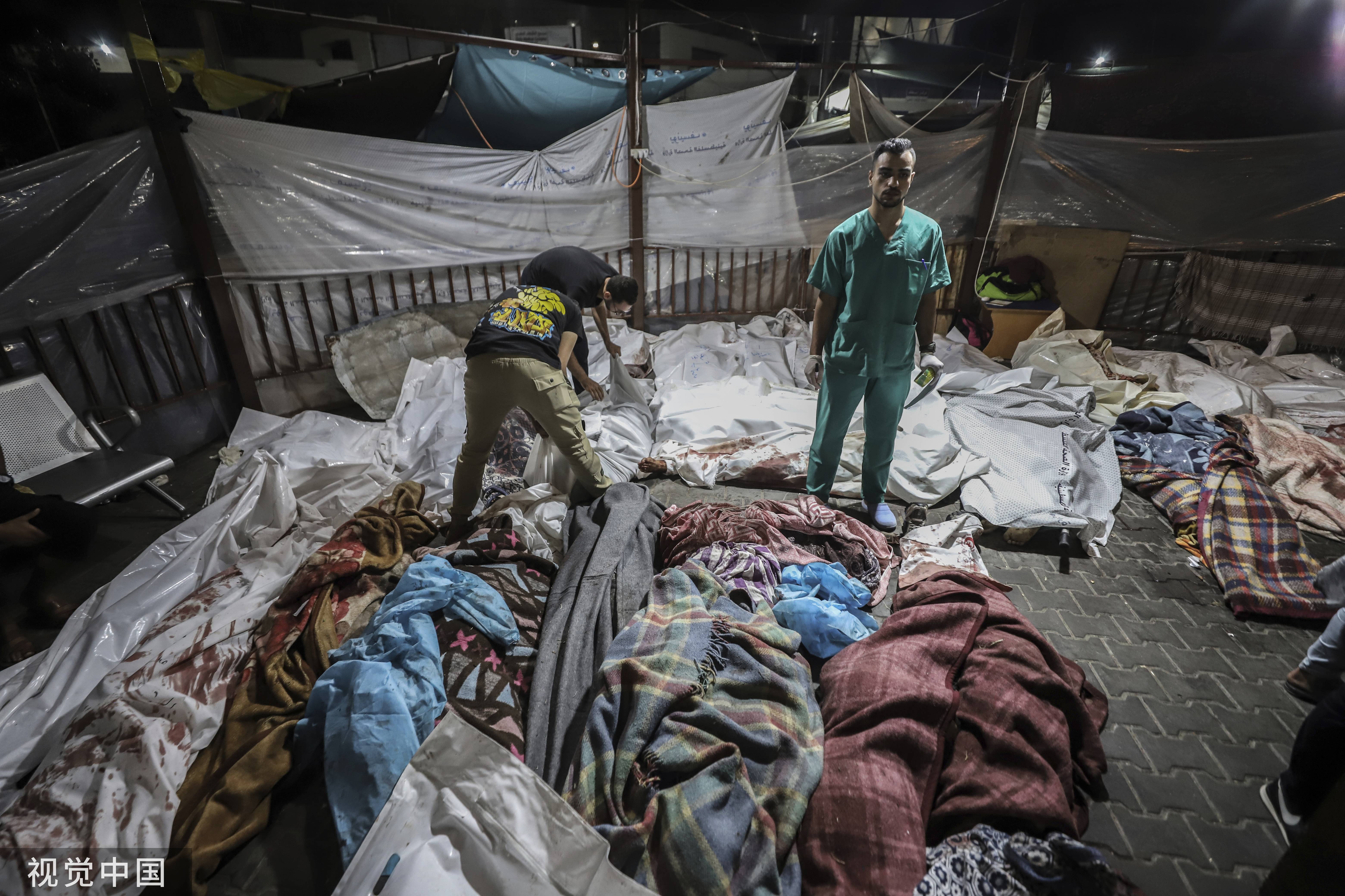 10月17日,星期二,晚上。 在经历了以色列利库德集团把持的军国主义政府连续9天的猛烈空袭、轰炸、扫荡之后,被封锁的加沙市几乎已被夷为平地。 被以色列军国主义政府断水断电围困在加沙地带的巴勒斯坦人们躲进了加沙北部阿赫利阿拉伯医院避难。 伤者、病人、家属、医护人员以及大量流离失所的人们,在医院仅有的发电机支撑下,竭尽全力,试图活着。