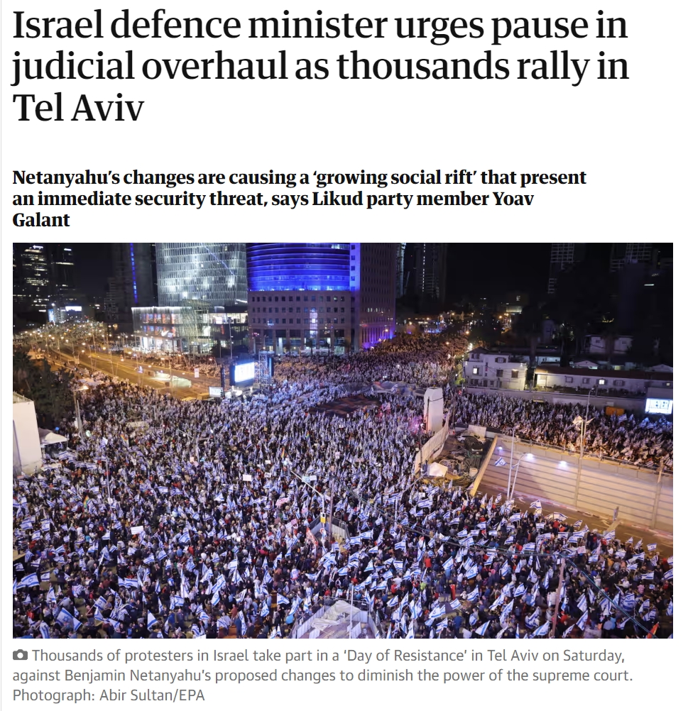 就在今年1月,以色列总工会开始了一场全国性大罢工,矛头直接指向内塔尼亚胡政府的司法改革建议。 在抗议浪潮中,内塔尼亚胡政府将工人们称作为“无政府主义者”。 这场抗议也将以色列军国主义政府内部的矛盾展现了出来。 3月25日,在63万人大集会后,以色列国防部长约阿夫·加兰特(Yoav Gallant)公开表示,希望内塔尼亚胡暂停司法改革。 他称,“日益加剧的社会裂痕已经渗透到军队和安全机构中”。 作为回应,内塔尼亚胡将加兰特解雇。